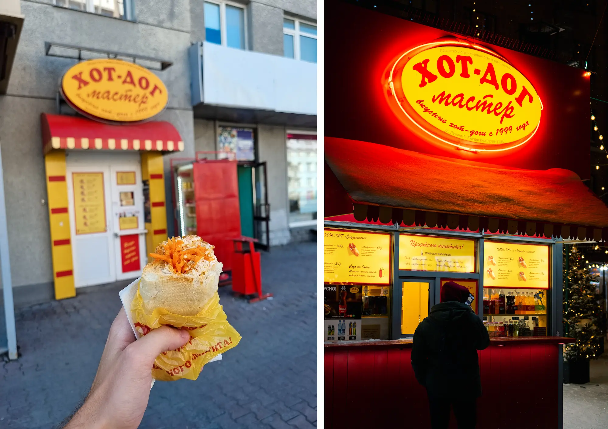 Легенда стрит-фуда и символ новосибирского общепита — «Хот-дог Мастер». В широкой сети желтых киосков продают булочку с молочной сосиской в море майонеза под шапкой из корейской морковки и тертого сыра — лучшее предложение в своей ценовой категории (меньше 100 ₽ за хот-дог).