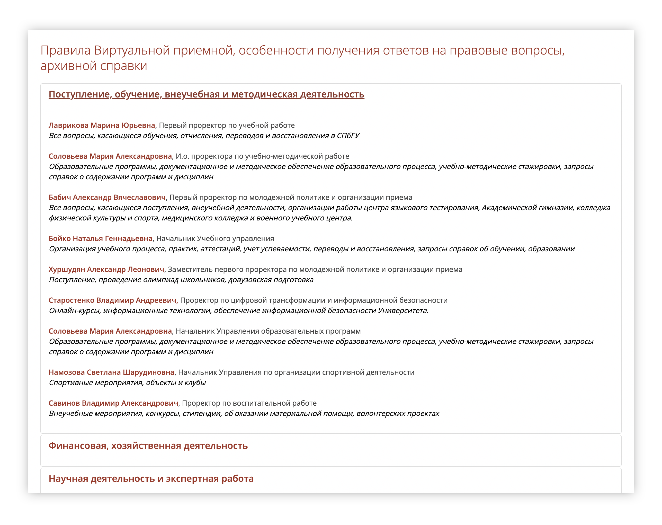 По закону на официальном сайте учебного заведения должны быть перечислены ответственные лица по каждому направлению деятельности и их контакты.